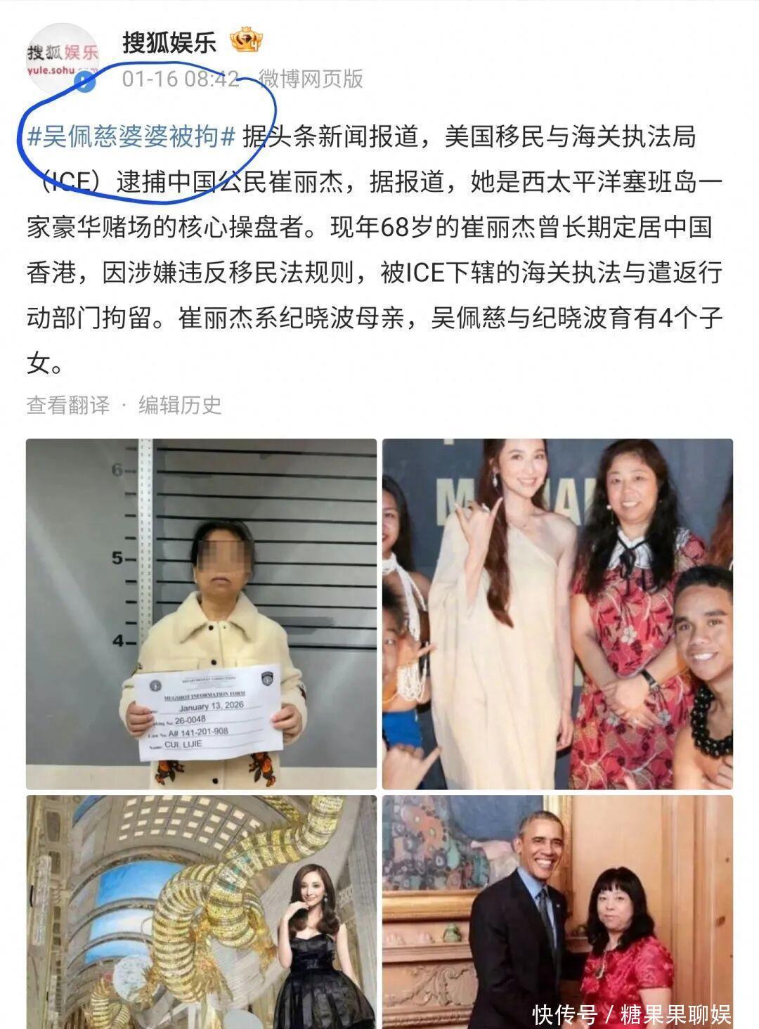 2026年1月13日,美国移民与海关执法局(ICE)在西太平洋的塞班岛上,拘留了一位中国籍的68岁女性。当被捕照片公布后,人们惊讶地发现,这位名叫崔丽杰的女性,是女星吴佩慈长期未婚伴侣纪晓波的母亲。