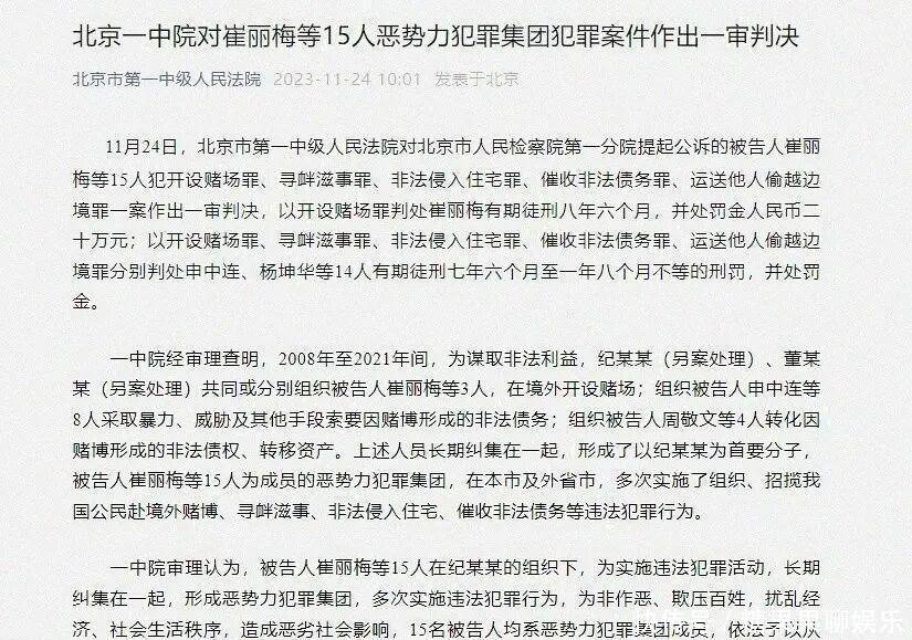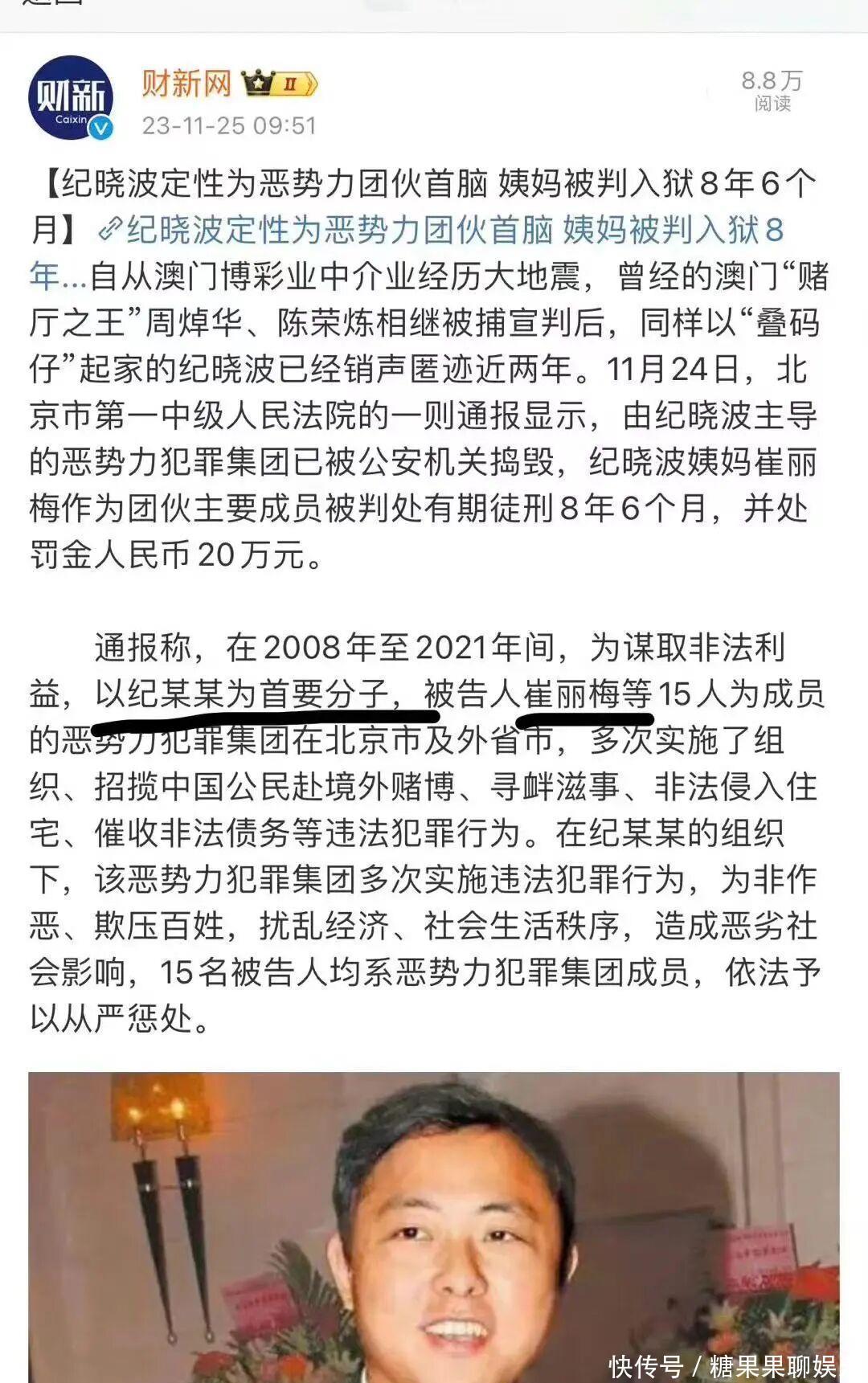 更为严重的是,纪晓波已被中国法律定性为恶势力团伙首脑。2023年,北京市第一中级人民法院通报,以纪晓波为首要分子的恶势力犯罪集团已被打掉。其姨妈崔丽梅作为团伙主要成员,被判刑8年6个月。
